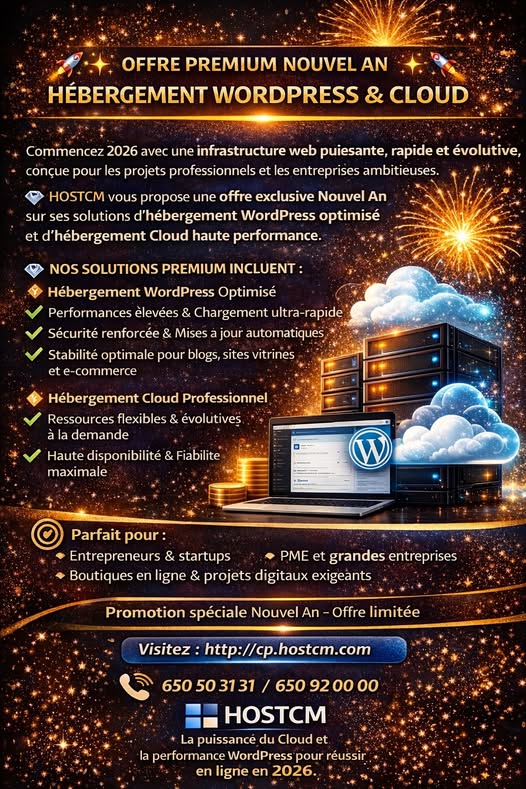 HOSTCM vous propose une offre exclusive Nouvel An sur ses solutions d’hébergement WordPress optimisé et Cloud haute performance.