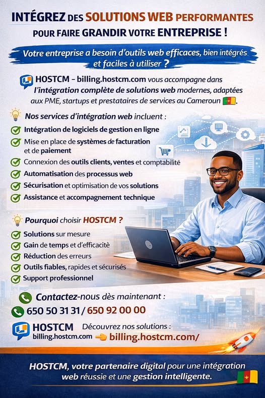 HOSTCM – billing.hostcm.com vous accompagne dans l’intégration complète de solutions web modernes, adaptées aux PME, startups et prestataires de services au Cameroun 🇨🇲.