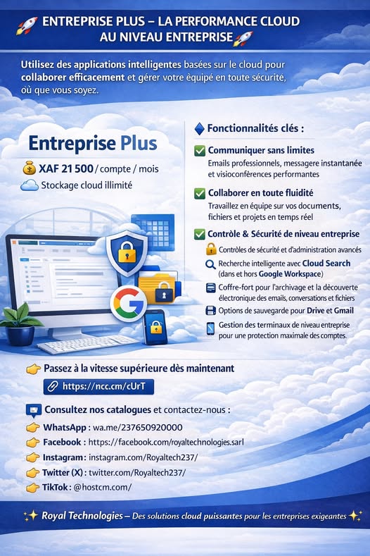 À l’ère du numérique, les entreprises ont besoin de solutions robustes, sécurisées et évolutives pour accompagner leur croissance. Entreprise Plus est une offre cloud haut de gamme conçue pour les organisations exigeantes qui souhaitent collaborer efficacement, gérer leurs équipes en toute sécurité et garder le contrôle total de leurs données, où qu’elles se trouvent.